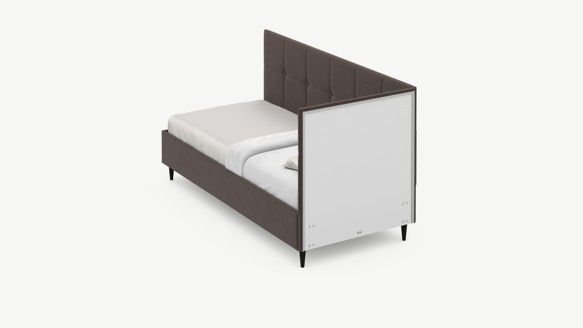 Угловая односпальная кровать MOON FAMILY 1261 с мягкой спинкой и изголовьем создаст в Вашей спальне ощущение уюта. Крупная квадратная стежка привносит в интерьер графических акцентов, а вставка из пуговиц наполняет пространство ощущением домашнего тепла.