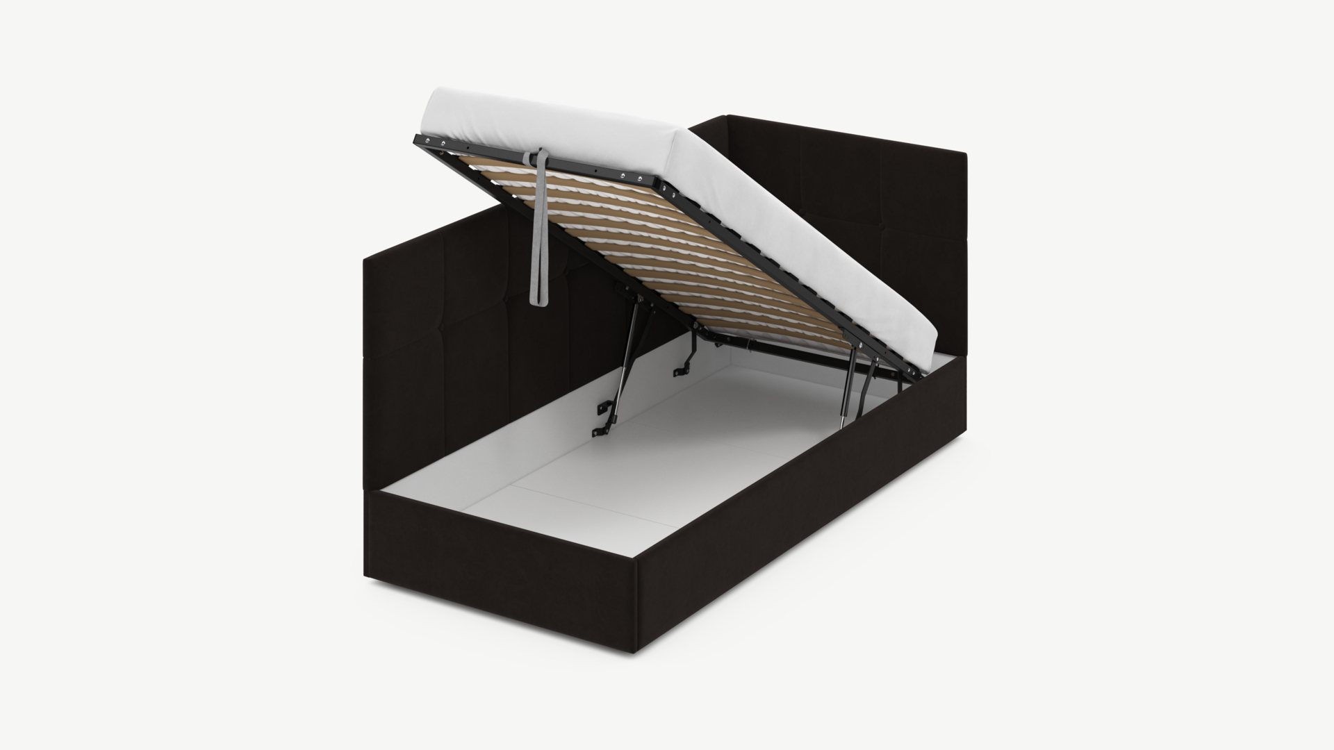 • Скрытая под основанием вместительная емкость без внутренних перегородок позволяет использовать всю площадь подкроватного пространства для хранения вещей.