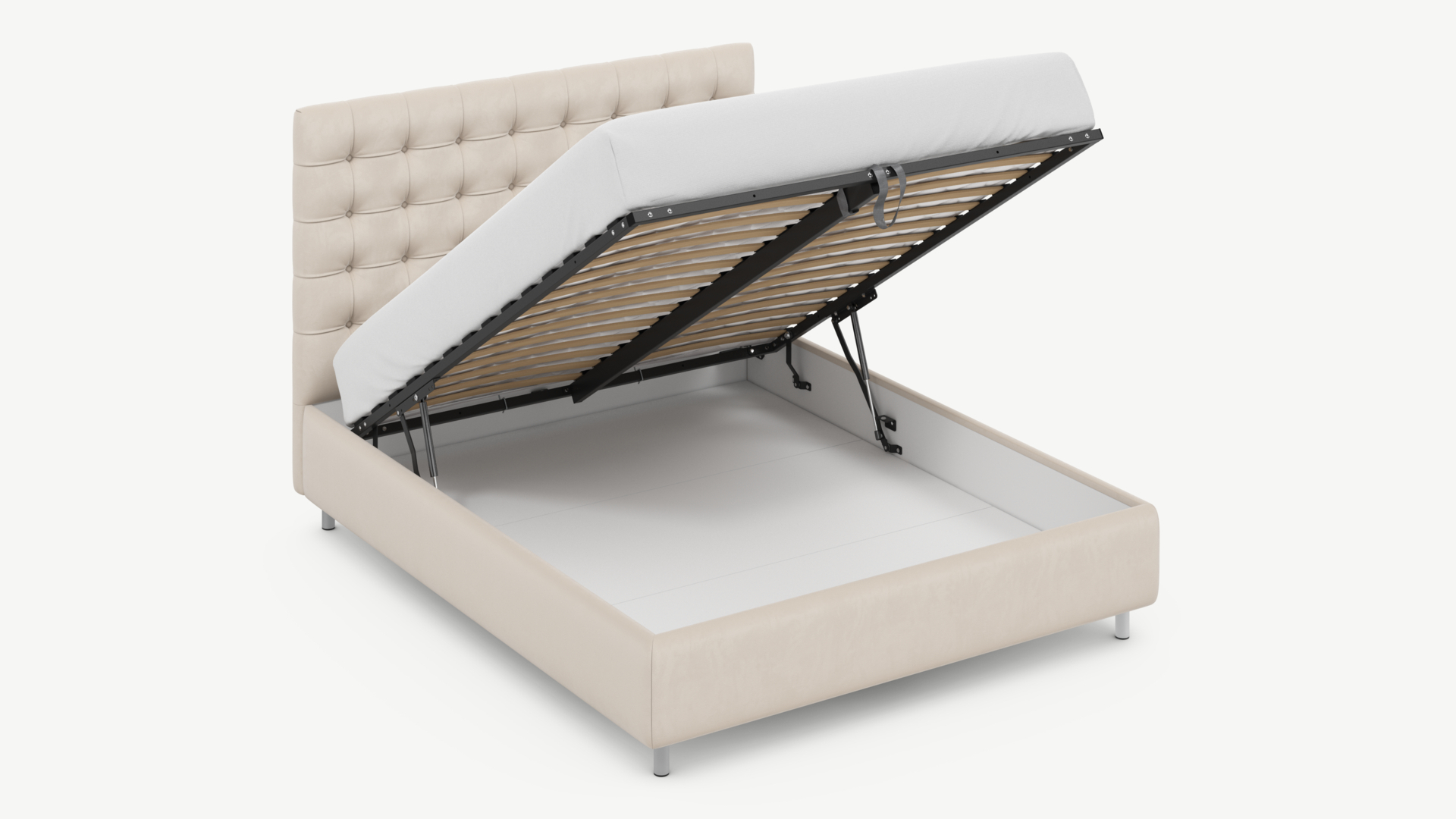 • Скрытая под основанием вместительная емкость без внутренних перегородок позволяет использовать всю площадь подкроватного пространства для хранения вещей.